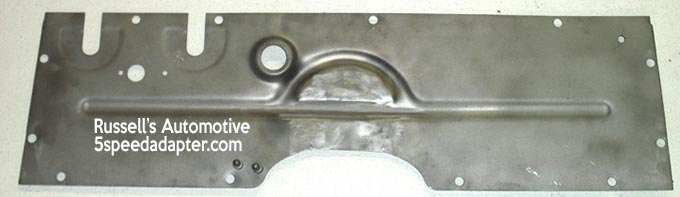 The T5 is almost 24” long so it will extend into the X-member on early cars. Because I wanted to install the T5 without having to remove the engine I needed to make the bottom plate of the X-member removable. I did this fairly quick with a cut-off tool and then had two new 1’ X 1/8” straps welded to the cut edges of the piece I removed. I clamped this piece in place and drilled four holes to complete the job.