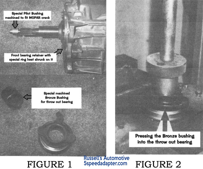 - Press fit the enclosed, larger bushing into the standard Mopar throw-out bearing. (Figure 1 & 2).