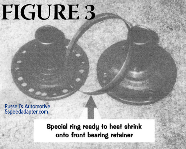 You may need to heat the enclosed thin ring over the front bearing retainer of the T-5. This insures and exact alignment of the T-5 transmission into the original bellhousing.